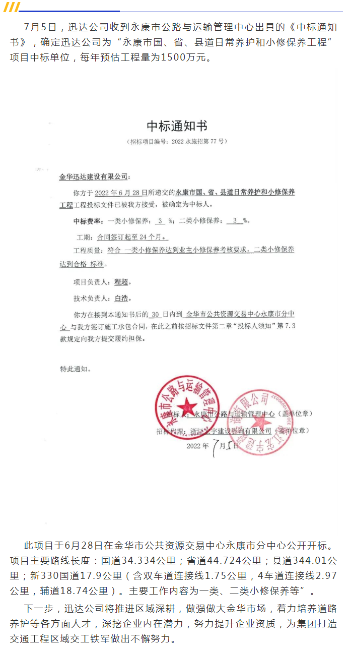 迅達(dá)公司中標(biāo)“永康市國(guó)、省、縣道日常養(yǎng)護(hù)和小修保養(yǎng)工程”